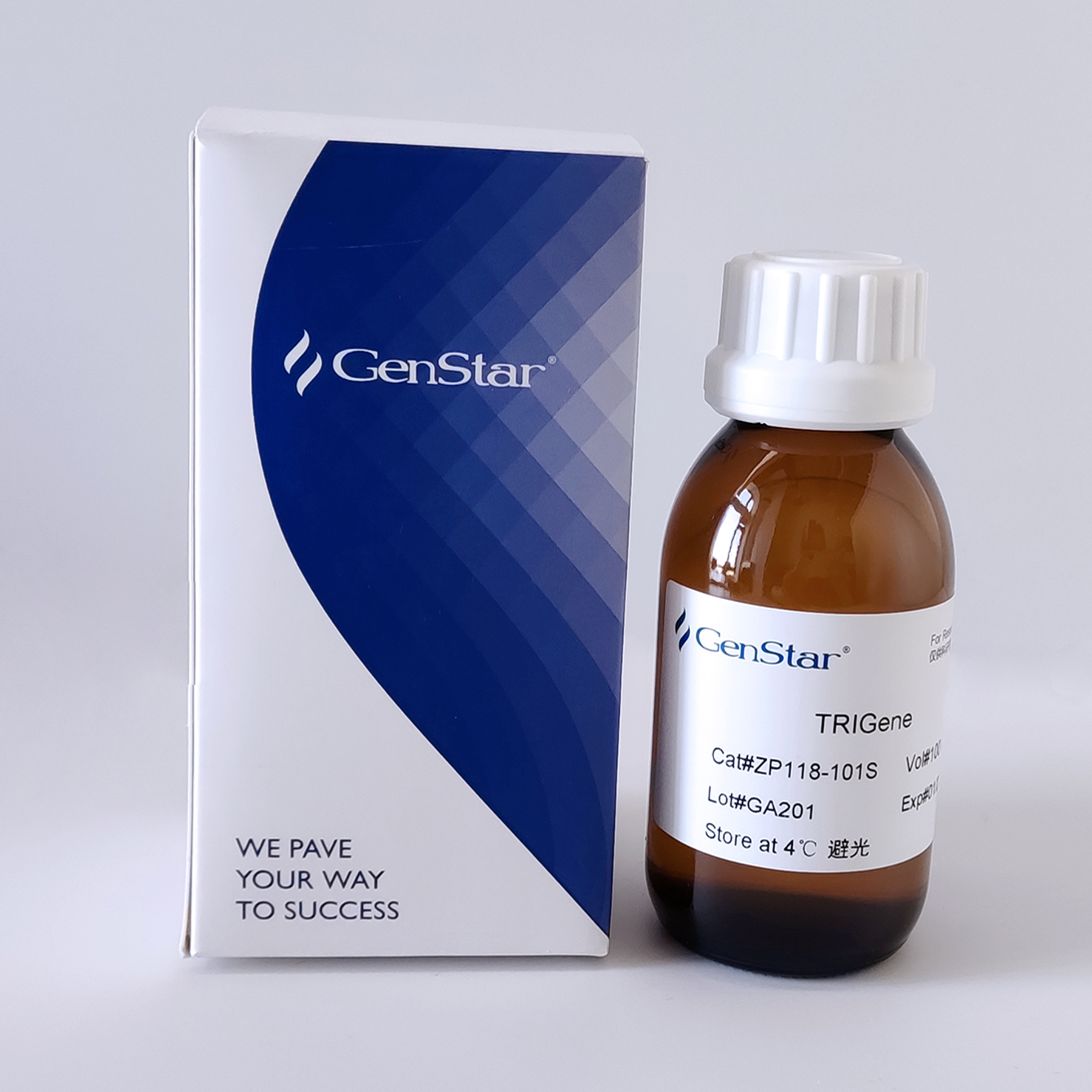 TRIGene 是基于 TriZol 原理制備的一種通用總 RNA 提取試劑。該方法簡便、快捷,適用于動植物細胞、組織、酵母細胞以及細菌的總 RNA 抽提。其原理是利用異硫氫酸胍/酚/氯仿法,快速裂解細胞,溶解細胞內含物,抑制核酸酶活性,從而有效防止 RNA 在提取過程中的降解。加入氯仿后,溶液分為水相和有機相。RNA 保留在上層水相中,分離后可用異丙醇沉淀回收。TRIGene 提取的總 RNA 產量大、純度高,無基因組 DNA 和蛋白質污染,可直接用于 RT-PCR、Northern blot、dot blot、polyA 篩選、體外翻譯、RNase 保護實驗和分子克隆等一系列操作。