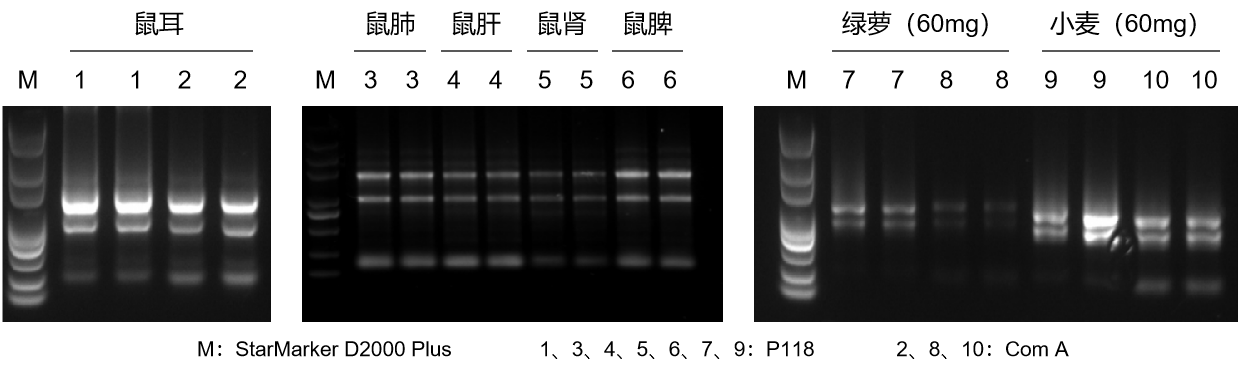 采用 GenStar #P118 提取小鼠不同部位組織、植物樣本綠蘿、小麥 RNA,進行瓊脂糖凝膠電泳。結果顯示,GenStar #P118 適用于動植物細胞、組織、酵母細胞、細菌等多種樣本的總 RNA 提取,且提取效果優(yōu)于 Com A。