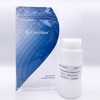 考馬斯亮藍染色脫色液(Coomassie Blue Destaining Buffer),可以搭配考馬斯亮藍 G-250 染色液(GenStar#E154),用于 SDS-PAGE 或非變性 PAGE 等蛋白電泳凝膠的常規(guī)染色和脫色,或 Western 轉(zhuǎn)膜后 PAGE 膠上殘余蛋白的檢測。