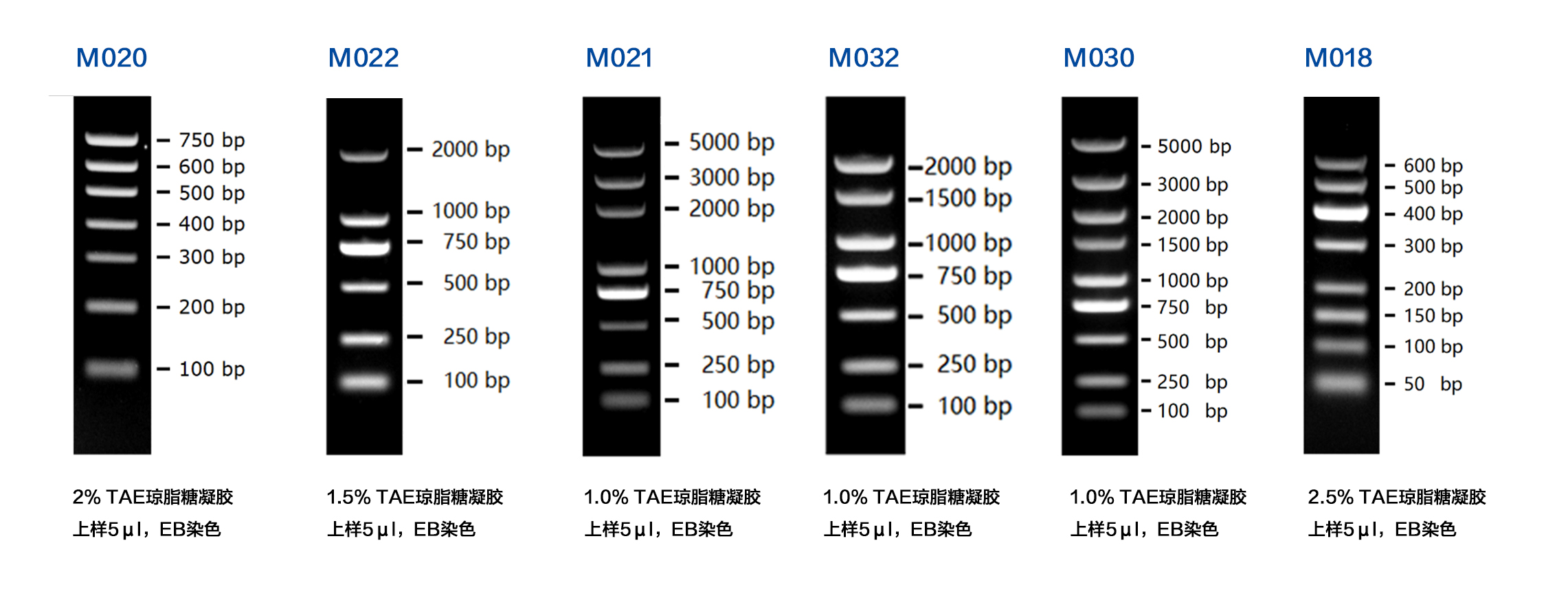 本產(chǎn)品為預(yù)混有 1x 上樣緩沖液的即用型 DNA 分子量標(biāo)準(zhǔn),由 7 條線狀雙鏈 DNA 條帶組成,適用于對 100-750 bp的雙鏈 DNA 分子大小的估算和粗略定量。本產(chǎn)品的 7 條帶和濃度分別為 750 bp(15 ng/ul)、600 bp(12 ng/ul)、500 bp(10 ng/ul)、400 bp(8 ng/ul)、300 bp(6 ng/ul)、200 bp(8 ng/ul)、100 bp(10 ng/ul)。