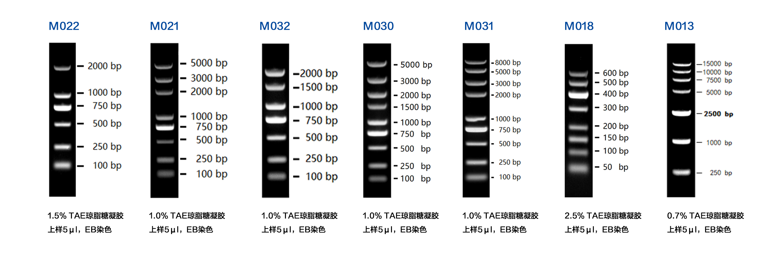 本產(chǎn)品為預(yù)混有 1× 上樣緩沖液的即用型 DNA 分子量標(biāo)準(zhǔn),由 9 條線狀雙鏈 DNA 條帶組成,適用于對(duì) 100-8000 bp 的雙鏈 DNA 分子大小的估算和粗略定量。本產(chǎn)品的 9 條帶分別為 100、250、500、750、1000、2000、3000 和 5000 bp、8000 bp。其中 750 bp 條帶濃度最大,為 100 ng/5 µl,其余條帶濃度約為 50 ng/5 µl。