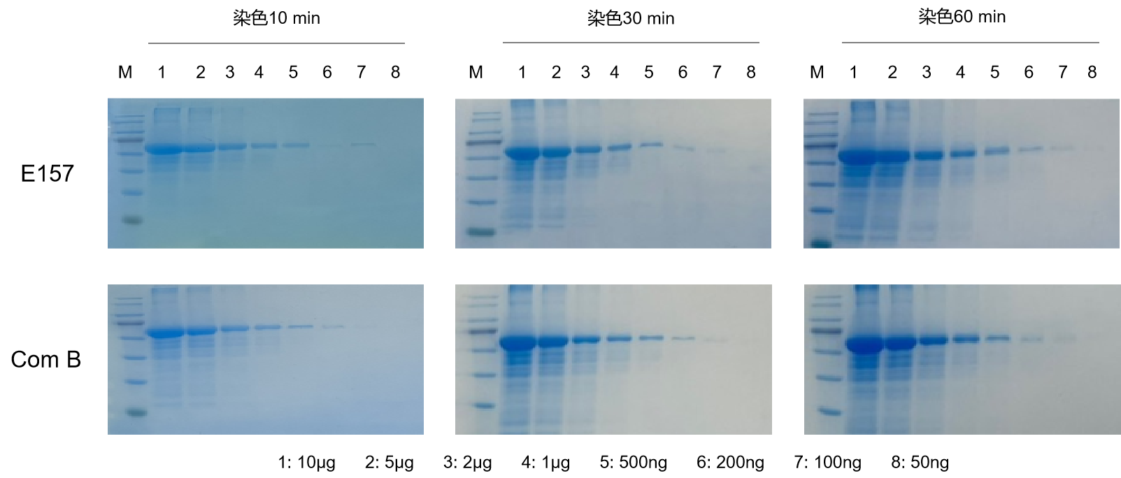 不同蛋白上樣量,經(jīng)不同時間染色及脫色后,可看到清晰的目標蛋白條帶。結(jié)果顯示,E157 在 10 min 時可見 200 ng 條帶,30 min可見 100 ng 條帶,60 min 可見低至50 ng條帶,因此,E157染色速度快、靈敏度高。