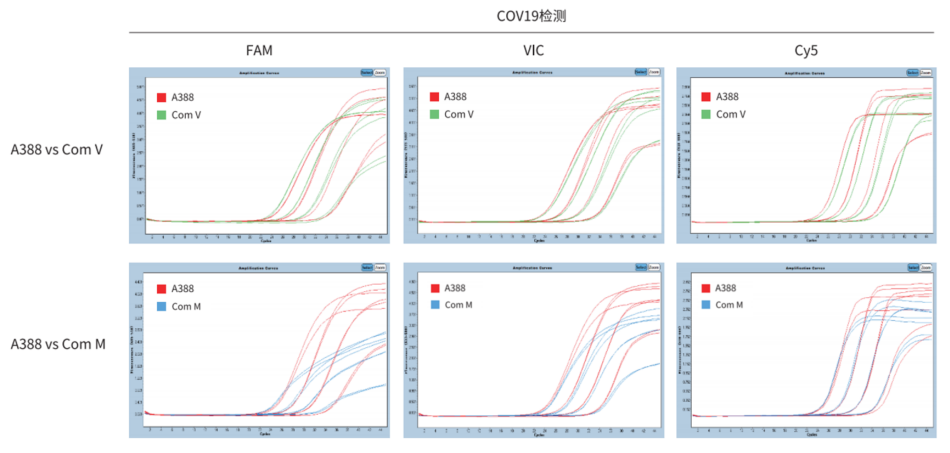 以不同濃度的 COV19 為模板,分別用 A388、 Com V 、Com M 進(jìn)行檢測(cè)。結(jié)果顯示,A388 和 Com V、Com M 擴(kuò)增效果相當(dāng),A388 擴(kuò)增曲線和熒光強(qiáng)度優(yōu)于 Com M