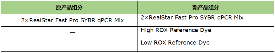 自 2024.08 起,該產(chǎn)品進行了組分優(yōu)化。優(yōu)化后的產(chǎn)品提供兩種濃度 ROX 參比染料即 High ROX Reference Dye 和 Low ROX Reference Dye,增加了產(chǎn)品適用性。