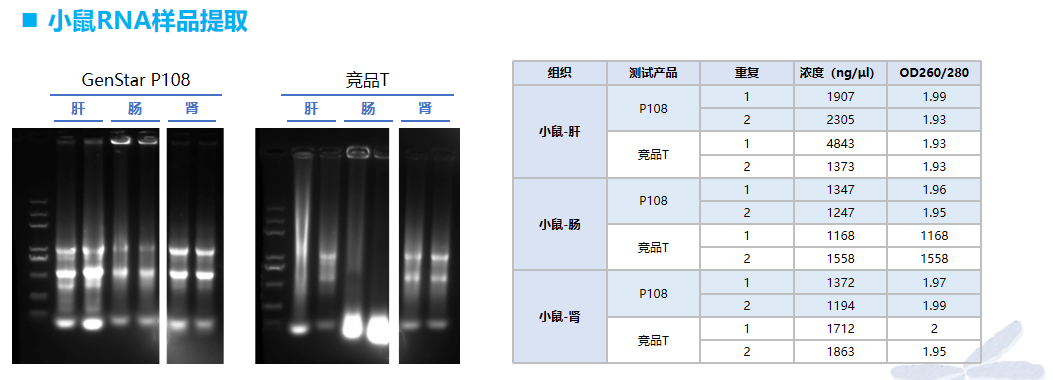 P108 可有效對(duì)小鼠不同器官組織進(jìn)行 RNA 提取,其提取得率與競品 T 相當(dāng),提取的 RNA 完整度優(yōu)于競品 T。