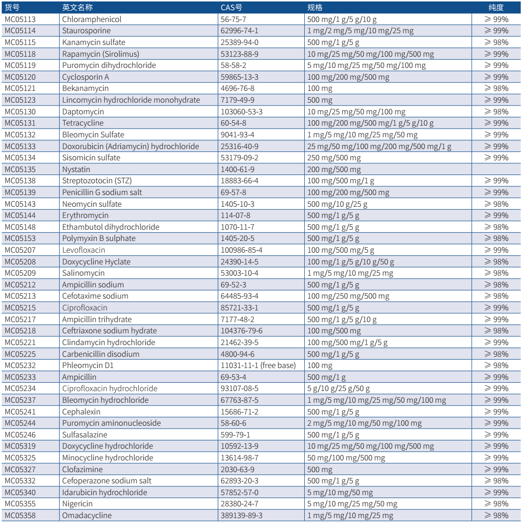 抗生素,主要是由細(xì)菌、霉菌或其他微生物產(chǎn)生的次級(jí)代謝產(chǎn)物或人工合成的類(lèi)似物。通??梢岳斫鉃槟軌驓⑺兰?xì)菌或抑制其生長(zhǎng)的試劑,主要用于治療各種細(xì)菌感染或致病微生物感染類(lèi)疾病,一般情況下對(duì)其宿主不會(huì)產(chǎn)生嚴(yán)重的副作用。GenStar 目前可提供多種抗生素用于科學(xué)研究,充分滿足您的實(shí)驗(yàn)需求,為您的實(shí)驗(yàn)保駕護(hù)航。