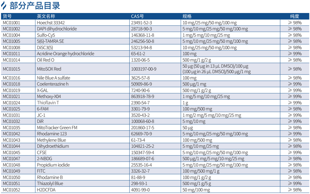 熒光染料是指吸收某一波長的光波后能發(fā)射出另一波長大于吸收光的光波的物質(zhì)。通過共價結(jié)合或物理吸附在所要研究物質(zhì)結(jié)構(gòu)中,借助熒光特性對被標記對象進行定性、定位以及定量分析。其在蛋白的功能研究、藥物篩選等領(lǐng)域具有廣泛的應(yīng)用。