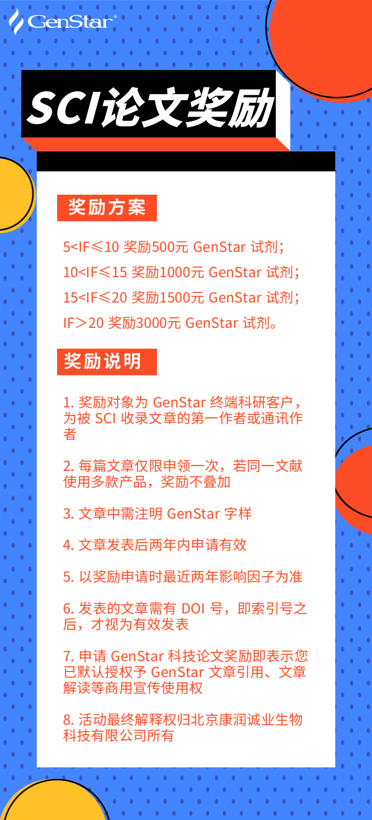 GenStar 自成立以來,一直深耕于分子生物學領域上游核心原料及配套體系的研發(fā),服務了全國數(shù)千家實驗室的科研人員。使用 GenStar 產品的 SCI 論文總數(shù)已達千余篇,其中包含《Nature》、《Science》、《Cell》等高水平的學術期刊。為了感謝廣大客戶的支持與信任,GenStar 繼續(xù)推行發(fā)表科技論文獎勵機,使用 GenStar 產品發(fā)表科技論文的人員均可申請。希望更多新老客戶參與其中,期待和您一起分享成功的喜悅。