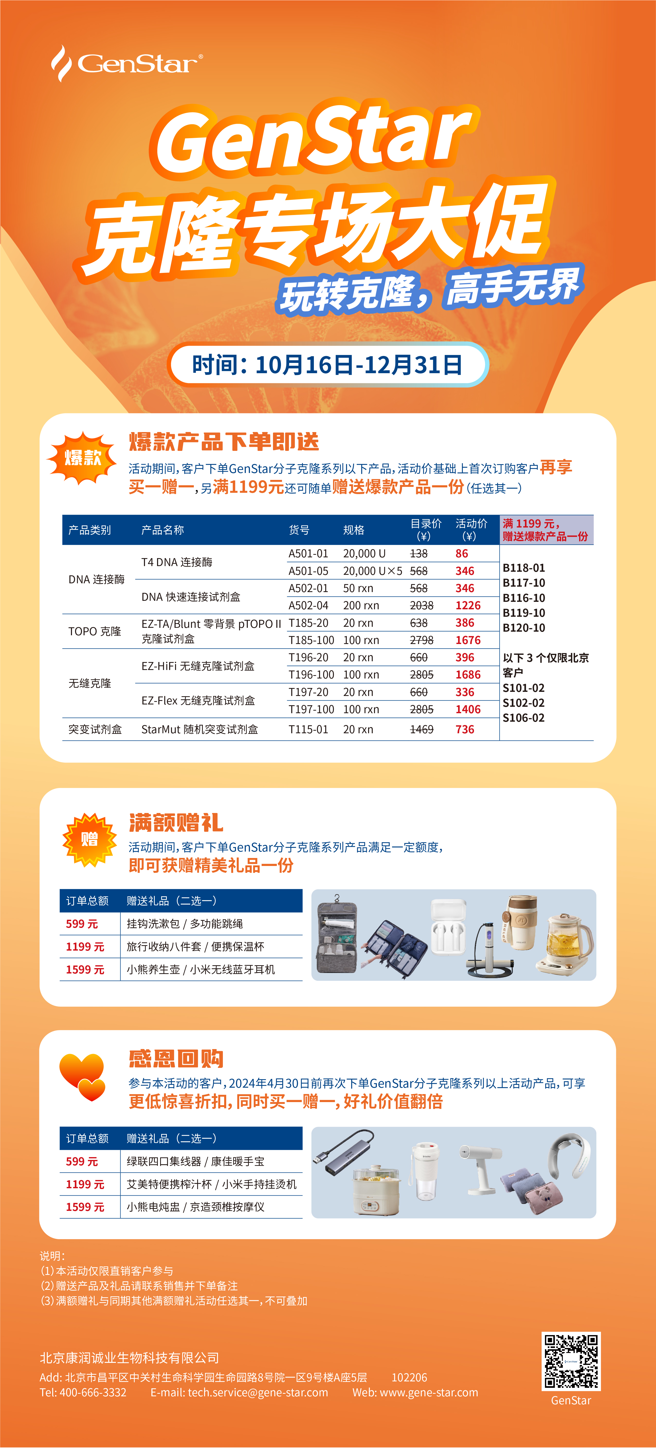 分子克隆是分子生物學(xué)的一項核心技術(shù),發(fā)展至今,從經(jīng)典的酶切酶連法、快捷簡單的TOPO克隆法到靈活高效的同源重組克隆,都有其各自的優(yōu)勢和應(yīng)用場景。GenStar的分子克隆系列產(chǎn)品經(jīng)過不斷優(yōu)化和迭代,自上市以來,備受眾多客戶的認可和支持。為回饋新老客戶,我們特推出分子克隆系列產(chǎn)品專場促銷,助您的分子克隆實驗脫離“靠運氣”的魔咒,從入門到精通。