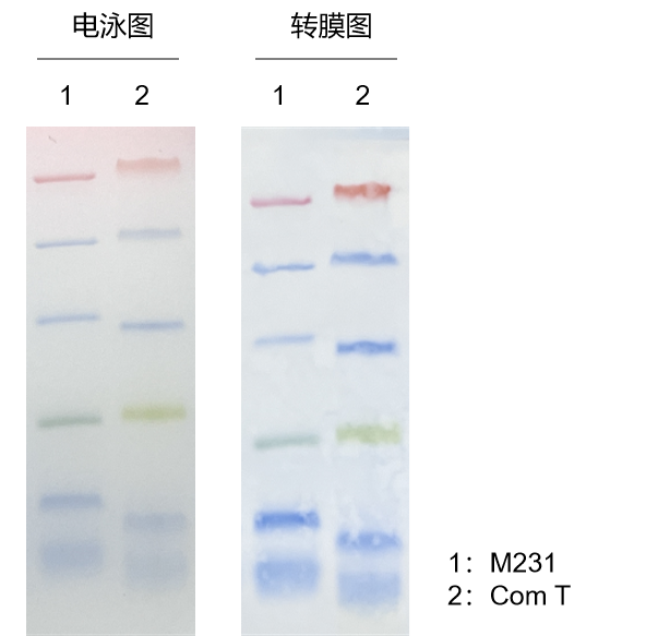 本產(chǎn)品包裝便利,為即用型產(chǎn)品,請(qǐng)勿加熱、稀釋或添加還原劑。使用本產(chǎn)品可動(dòng)態(tài)觀察蛋白電泳狀態(tài)和轉(zhuǎn)膜效果。經(jīng)SDS-PAGE 電泳后轉(zhuǎn)移到 PVDF 膜、NC 膜上可見(jiàn)清晰的彩色條帶。預(yù)染蛋白與染料結(jié)合后,在不同緩沖體系中,位置會(huì)有遷移,本產(chǎn)品在用于判斷目的蛋白分子量大小時(shí)僅供參考。