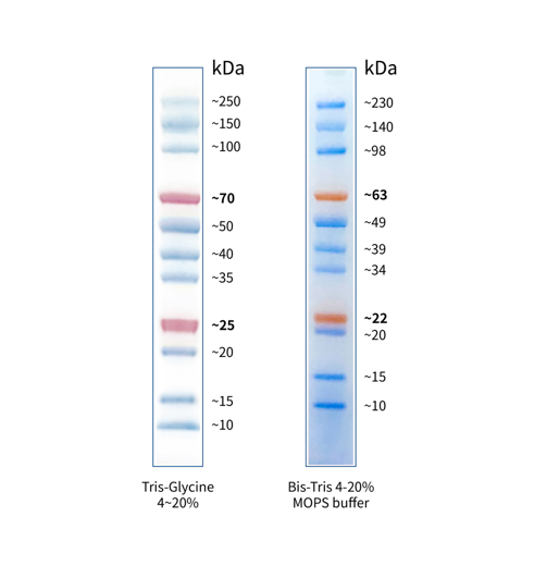 本產(chǎn)品由跨度從 10-250 kDa 的 11 種高度純化的橙色、藍色預染蛋白質組成。其中 25 kDa 條帶和 70 kDa 條帶為橙紅色預染條帶。本產(chǎn)品適合作為 SDS-PAGE 電泳時,變性蛋白樣品的分子量參照,并可實時觀察蛋白樣品的電泳分離狀況,也可用于檢測 Western blot 的轉膜效率。由于共價結合的染料會影響蛋白質分子的電泳遷移率,本產(chǎn)品僅適于粗略地估計目的蛋白樣品的分子量。