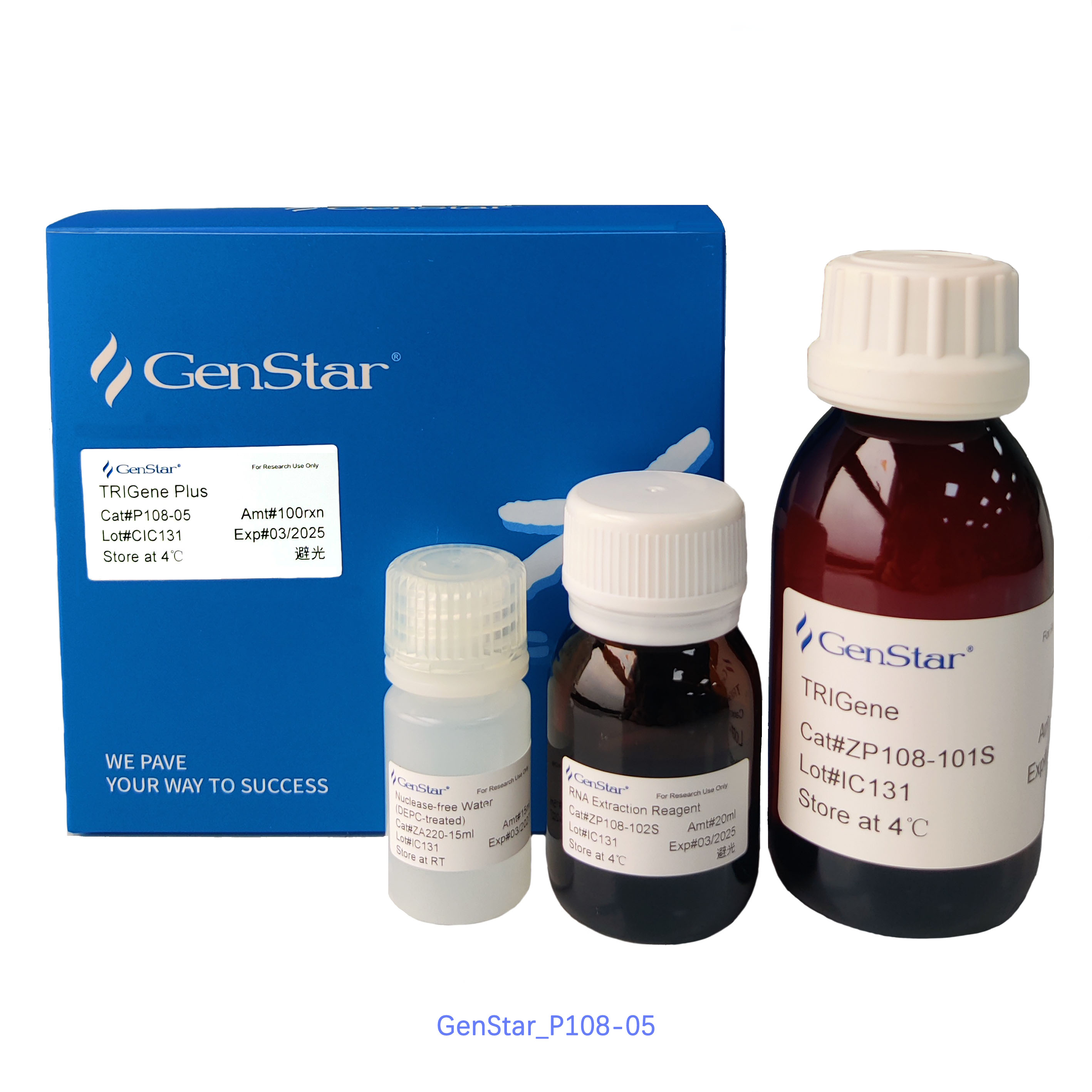 TRIGene Plus 是基于 TriZol 原理制備的一種通用總 RNA 提取試劑。其原理是利用異硫氫酸胍/酚,快速裂解細胞,溶解細胞內含物,抑制核酸酶活性;而后加入 RNA 抽提試劑(RNA Extraction Reagent)去除雜蛋白,RNA 保留在上層水相中,分離后可用異丙醇沉淀回收獲得。采用 RNA Extraction Reagent 替代了氯仿進行 RNA 抽提,上下分相更加清晰且操作安全性更高。使用本產品提取 RNA 純度高,完整度好,產量媲美傳統氯仿法抽提,可直接用于 RT-PCR、Northernblot、dotblot、polyA 篩選、體外翻譯、RNase 保護實驗和分子克隆等一系列操作。