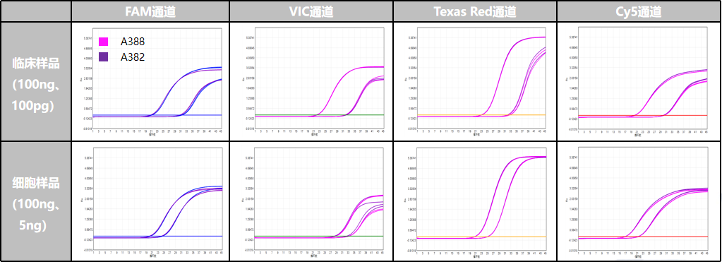 2×Multiplex 一步法qRT-PCR 探針法檢測預混液(UNG)(Cat#A382)與 Multiplex 一步法qRT-PCR試劑盒-探針法(UNG)(Cat#A388)的性能一致,檢測效率相當。